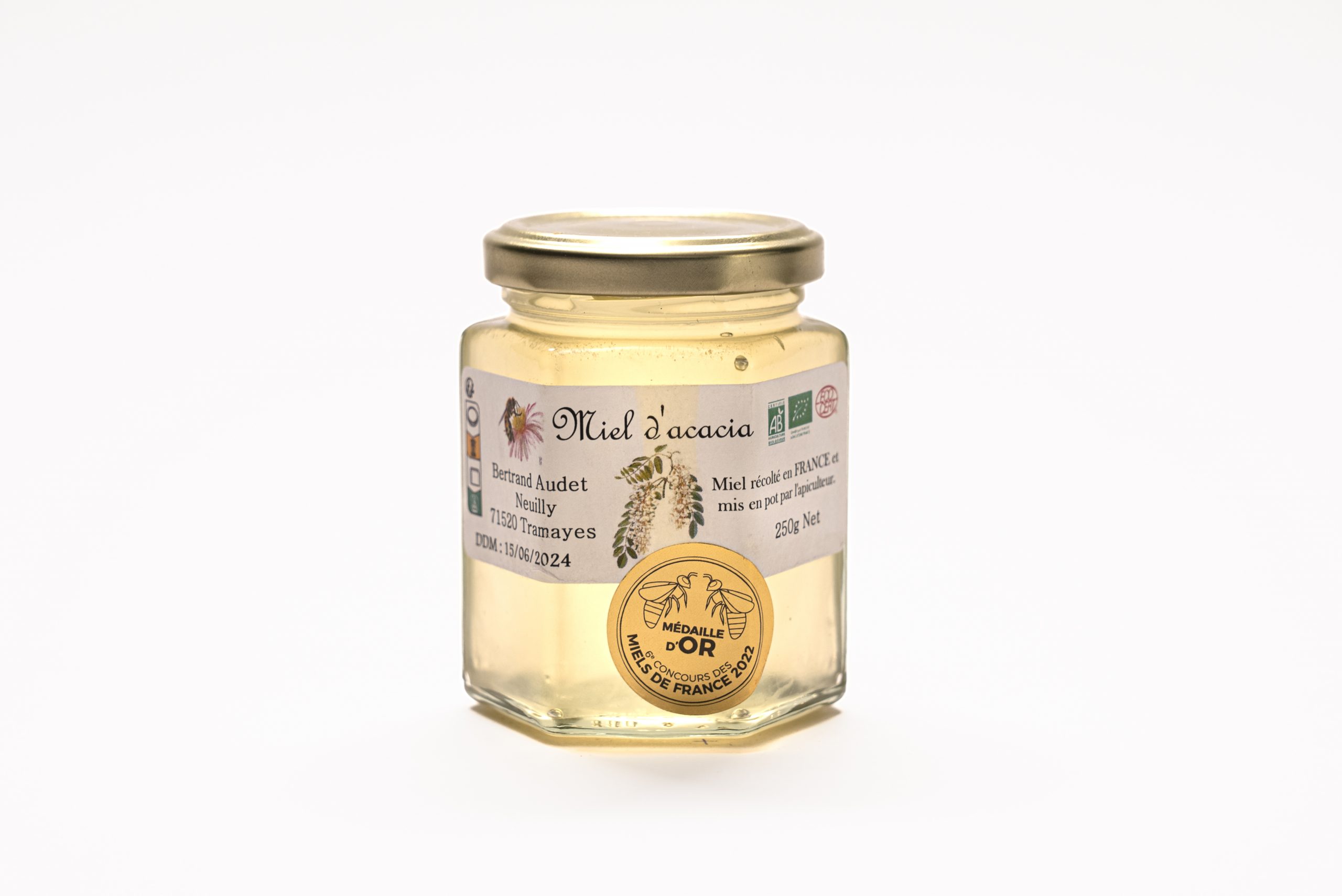 Miel d’acacia primé au Concours National des Apiculteurs de France.