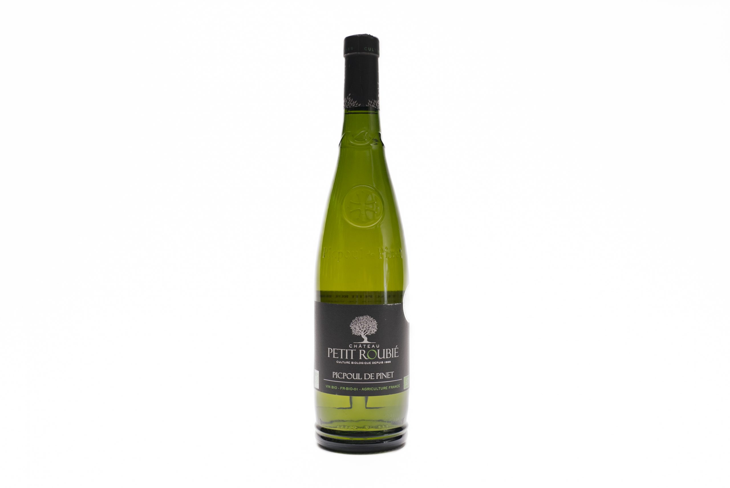 Le Picpoul de Pinet du domaine de Roubié offre une robe or pâle aux reflets verts brillants et un nez intense aux arômes riches de pomelo, citron, ananas mûr et notes florales.